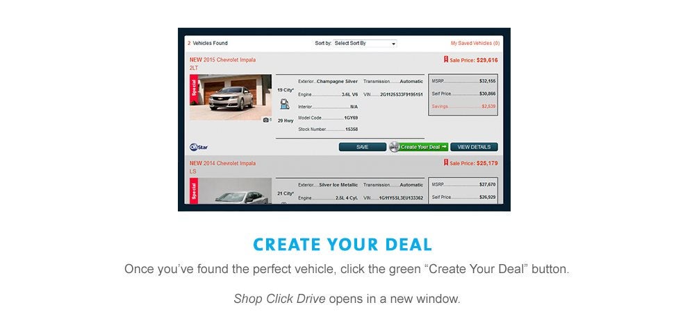 Search for a vehicle in Coughlin Marysville GMs inventory. When you find the vehicle you like, click the green “Create Your Deal” button for that vehicle and the Shop Click Drive window will open.