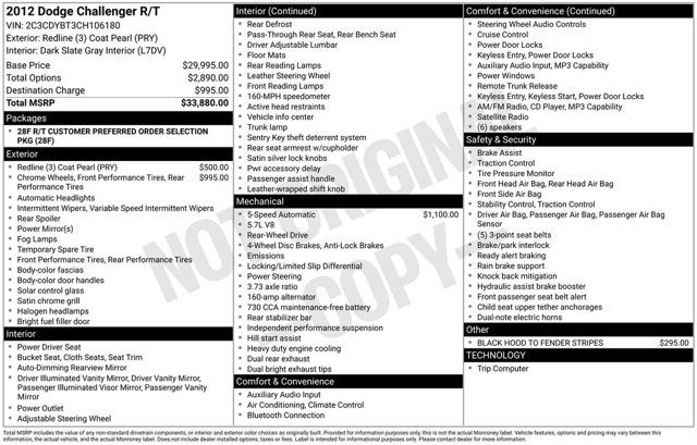 18 x 7.5 Aluminum Wheels, 20 x 8.0 Chrome Clad Aluminum Wheels, 3.92 Rear Axle Ratio, 4-Wheel Disc Brakes, 6 Speakers, ABS brakes, Air Conditioning, Alloy wheels, AM/FM radio: SIRIUS, Anti-whiplash front head restraints, Audio Jack Input for Mobile Devices, Auto-dimming Rear-View mirror, Automatic temperature control, Black Hood To Fender Stripe, Brake assist, Bumpers: body-color, CD player, Cloth Low-Back Bucket Seats, Delay-off headlights, Driver door bin, Driver vanity mirror, Dual front impact airbags, Dual front side impact airbags, Electronic Stability Control, Four wheel independent suspension, Front anti-roll bar, Front Bucket Seats, Front Center Armrest, Front fog lights, Front reading lights, Fully automatic headlights, Illuminated entry, Leather Shift Knob, Low tire pressure warning, Overhead airbag, Overhead console, Panic alarm, Passenger door bin, Passenger vanity mirror, Power door mirrors, Power driver seat, Power steering, Power windows, Quick Order Package 28F, Radio data system, Radio: Media Center 130 CD/MP3, Rear anti-roll bar, Rear seat center armrest, Rear window defroster, Remote keyless entry, SIRIUS Satellite Radio, Speed control, Speed-sensing steering, Split folding rear seat, Spoiler, Steering wheel mounted audio controls, Tachometer, Telescoping steering wheel, Tilt steering wheel, Traction control, Trip computer, Variably intermittent wipers. 2012 Dodge Challenger Clean CARFAX.