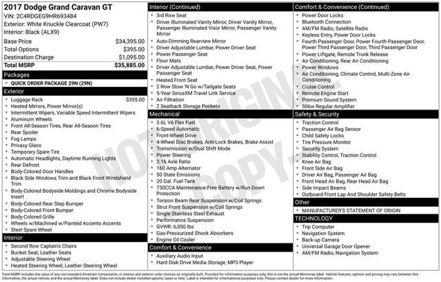 115V Auxiliary Power Outlet, 17 x 6.5 Aluminum Wheels, 2 Row Stow 'N Go w/Tailgate Seats, 2nd Row Buckets w/Fold-In-Floor, 3.16 Axle Ratio, 3rd row seats: split-bench, 4-Wheel Disc Brakes, 40GB Hard Drive w/28GB Available, 5-Year SiriusXM Travel Link Service, 6.5 Touchscreen Display, 9 Speakers, ABS brakes, Air Conditioning, Alloy wheels, AM/FM radio: SiriusXM, Anti-whiplash front head restraints, Audio Jack Input for Mobile Devices, Auto-dimming Rear-View mirror, Automatic temperature control, Black Side Roof Rails, Bodyside moldings, Brake assist, Bumpers: body-color, CD player, Compass, Delay-off headlights, Driver door bin, Driver vanity mirror, Driver's Seat Mounted Armrest, Dual front impact airbags, Dual front side impact airbags, DVD-Audio, Electronic Stability Control, Front anti-roll bar, Front Bucket Seats, Front dual zone A/C, Front fog lights, Front reading lights, Front wheel independent suspension, Fully automatic headlights, Garage door transmitter, Garmin Navigation System, Heated door mirrors, Heated front seats, Heated rear seats, Heated steering wheel, Illuminated entry, Integrated Roof Rail Crossbars, Knee airbag, Leather Shift Knob, Leather Trimmed Bucket Seats, Low tire pressure warning, Manufacturer's Statement of Origin, Navigation system: Garmin, Occupant sensing airbag, Outside temperature display, Overhead airbag, Overhead console, Panic alarm, ParkView Rear Back-Up Camera, Passenger door bin, Passenger seat mounted armrest, Passenger vanity mirror, Performance Suspension, Power door mirrors, Power driver seat, Power Liftgate, Power passenger seat, Power steering, Power windows, Quick Order Package 29N, Radio data system, Radio: 430 Nav, Radio: 430 Nav (DISC), Rear air conditioning, Rear reading lights, Rear window defroster, Rear window wiper, Reclining 3rd row seat, Remote keyless entry, Security system, SiriusXM Travel Link, Speed control, Split folding rear seat, Spoiler, Steering wheel mounted audio controls, Tachometer, Telescoping steering wheel, Tilt steering wheel, Traction control, Trip computer, Variably intermittent wipers. 2017 Dodge Grand Caravan