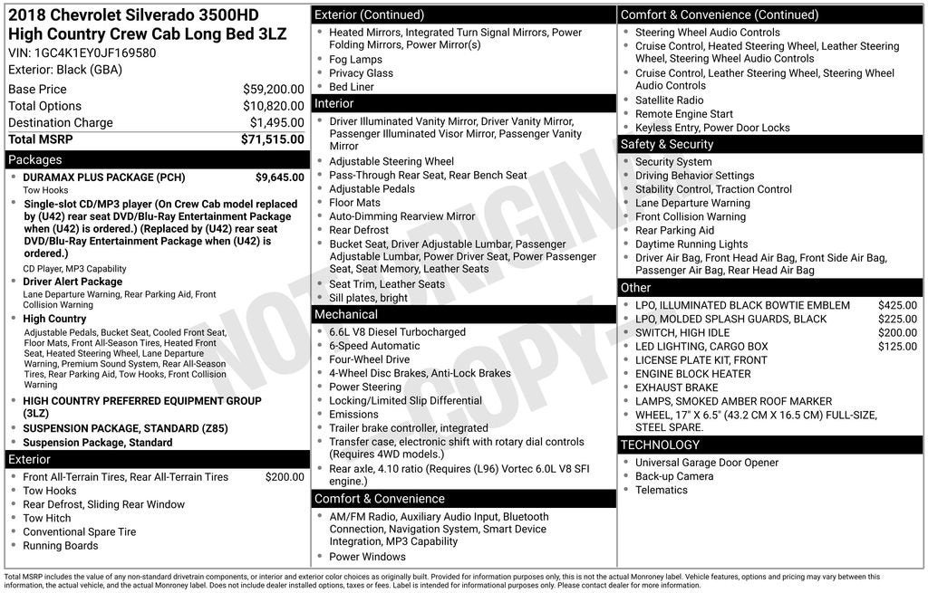 110-Volt AC Power Outlet, 150 Amps Alternator, 4 Movable Upper Cargo Tie Downs, 4-Wheel Disc Brakes, 4.2 Diagonal Color Display Driver Info Center, 7 Speakers, ABS brakes, Adjustable pedals, Air Conditioning, Alloy wheels, AM/FM radio, Auto-Dimming Inside Rear-View Mirror, Auto-dimming Rear-View mirror, Automatic temperature control, Black Molded Splash Guards (LPO), Body-Color Front Bumper, Body-Color Rear Bumper, Bodyside moldings, Bose 7 Speaker Sound System, Brake assist, Bright Sill Plates, Bumpers: body-color, Carpeted Front & Rear Floor Mats, CD player, Chevrolet Connected Access, Chevrolet w/4G LTE, Chrome Bodyside Moldings, Chrome Door Handles, Chrome Power-Adjustable Heated Outside Mirrors, Chrome Recovery Hooks, Color-Keyed Carpeting Floor Covering, Compass, Deep-Tinted Glass, Delay-off headlights, Digital Steering Assist, Driver & Front Passenger Visors, Driver Alert Package, Driver door bin, Driver vanity mirror, Dual front impact airbags, Dual front side impact airbags, Dual-Zone Automatic Climate Control, Duramax Plus Package, Electric Rear-Window Defogger, Electronic Shift Transfer Case, Electronic Stability Control, Emergency communication system, Engine Block Heater, Exhaust Brake, Exterior Parking Camera Rear, EZ-Lift & Lower Tailgate, Floor Mounted Console, Forward Collision Alert, Front anti-roll bar, Front Bucket Seats, Front Center Armrest, Front dual zone A/C, Front fog lights, Front Frame-Mounted Black Recovery Hooks, Front Full Feature Bucket Seats, Front Halogen Fog Lamps, Front License Plate Kit, Front reading lights, Front wheel independent suspension, Fully automatic headlights, Garage door transmitter, HD Radio, Heated & Vented Front Seating, Heated door mirrors, Heated front seats, Heated steering wheel, High Idle Switch, Illuminated Black Bowtie Emblem (LPO), Illuminated entry, Lane Departure Warning System, Leather Wrapped Heated Steering Wheel, Leather-Wrapped Steering Wheel, LED Cargo Box Lighting, Manual Tilt-Wheel/Telescoping Steering Column, Memory seat, Navigation System, Occupant sensing airbag, OnStar & Chevrolet Connected Services Capable, Outside temperature display, Overhead airbag, Overhead console, Panic alarm, Passenger door bin, Passenger vanity mirror, Pedal memory, Perforated Leather-Appointed Seat Trim, Power Adjustable Pedals, Power door mirrors, Power driver seat, Power passenger seat, Power Sliding Rear Window w/Defogger, Power steering, Power Windows, Power windows, Preferred Equipment Group 3LZ, Premium audio system: Chevrolet MyLink, Radio: Chevrolet MyLink w/Navigation, Rear 60/40 Folding Bench Seat (Folds Up), Rear reading lights, Rear seat center armrest, Rear step bumper, Rear window defroster, Remote Keyless Entry, Remote keyless entry, Remote Locking Tailgate, Remote Vehicle Starter System, Security system, Single-Slot CD/MP3 Player, SiriusXM Satellite Radio, Speed control, Speed-sensing steering, Split folding rear seat, Spray-On Pickup Box Bed Liner w/Bowtie Logo, Standard Suspension Package, Steering Wheel Audio Controls, Steering wheel mounted audio controls, Tachometer, Telescoping steering wheel, Tilt steering wheel, Traction control, Trailering Equipment, Trip computer, Turn signal indicator mirrors, Ultrasonic Front & Rear Park Assist, Unauthorized Entry Theft-Deterrent System, Universal Home Remote, Variably intermittent wipers, Ventilated front seats, Voltmeter, Wireless Charging. 2018 Chevrolet Silverado 3500HD