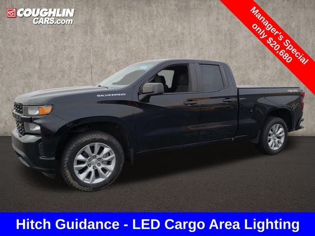 Silverado 1500 Custom, 4D Double Cab, EcoTec3 4.3L V6, 6-Speed Automatic Electronic with Overdrive, 4WD, Black, Black Cloth, Custom Convenience Package, Electric Rear-Window Defogger, EZ Lift Power Lock & Release Tailgate, Hitch Guidance, LED Cargo Area Lighting, Remote Vehicle Starter System, Theft Deterrent System (Unauthorized Entry), Trailering Package, 170 Amp Alternator, 3.42 Rear Axle Ratio, 3.5 Diagonal Monochromatic Display, 4-Wheel Disc Brakes, 6 Speakers, ABS brakes, Air Conditioning, Alloy wheels, AM/FM radio, Apple CarPlay/Android Auto, Bluetooth® For Phone, Brake assist, Cloth Seat Trim, Color-Keyed Carpeting Floor Covering, Deep-Tinted Glass, Delay-off headlights, Driver door bin, Driver vanity mirror, Dual front impact airbags, Dual front side impact airbags, Electronic Cruise Control, Electronic Stability Control, Exterior Parking Camera Rear, Front 40/20/40 Split-Bench Seat, Front anti-roll bar, Front Center Armrest, Front reading lights, Front Rubberized Vinyl Floor Mats, Front wheel independent suspension, Fully automatic headlights, Heated door mirrors, Heavy-Duty Rear Locking Differential, Illuminated entry, Locking Tailgate, Low tire pressure warning, Manual Tilt Wheel Steering Column, Occupant sensing airbag, Outside temperature display, Overhead airbag, Overhead console, Panic alarm, Passenger door bin, Passenger vanity mirror, Polished Exhaust Tip, Power Door Locks, Power door mirrors, Power Front Windows w/Driver Express Up/Down, Power Front Windows w/Passenger Express Down, Power Rear Windows w/Express Down, Power steering, Power windows, Premium audio system: Chevrolet Infotainment System 3, Radio data system, Radio: Chevrolet Infotainment 3 System, Rear 60/40 Folding Bench Seat (Folds Up), Rear reading lights, Rear Rubberized-Vinyl Floor Mats, Rear step bumper, Remote Keyless Entry, Remote keyless entry, Speed control, Speed-sensing steering, Split folding rear seat, Tachometer, Tilt steering wheel, Traction control, Trip computer, Variably intermittent wipers, Voltmeter, Silverado 1500 Custom, 4D Double Cab, EcoTec3 4.3L V6, 6-Speed Automatic Electronic with Overdrive, 4WD, Black, Black Cloth, Custom Convenience Package, Electric Rear-Window Defogger, EZ Lift Power Lock & Release Tailgate, Hitch Guidance, LED Cargo Area Lighting, Remote Vehicle Starter System, Theft Deterrent System (Unauthorized Entry), Trailering Package.