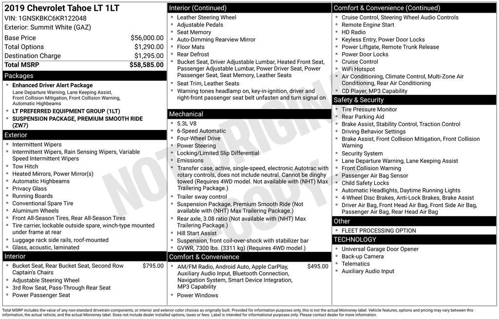 Summit White 2019 Chevrolet Tahoe LTAwards:* JD Power Initial Quality Study * 2019 KBB.com Best Resale Value Awards Please call or e-mail first for the best and quickest information. Visit www.coughlinpataskala.com to see more of this store’s new and used vehicle inventory for sale. Price excludes tax, title, license and document fee. While we make every effort to prevent pricing errors, key stroke and human errors do occur. Please contact dealer for details.