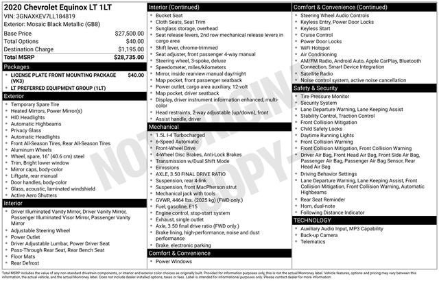 Equinox LT, 4D Sport Utility, 1.5L DOHC, 6-Speed Automatic Electronic with Overdrive, FWD, Mosaic Black Metallic, Jet Black Cloth, Preferred Equipment Group 1LT, 17 Aluminum Wheels, 2 Rear USB Charging-Only Ports, 2 USB Ports & Auxiliary Input Jack, 2-Way Power Driver Lumbar Control Seat Adjuster, 3.50 Final Drive Axle Ratio, 4-Wheel Disc Brakes, 6 Speaker Audio System Feature, 6 Speakers, 8-Way Power Driver Seat Adjuster, ABS brakes, Air Conditioning, Alloy wheels, AM/FM radio: SiriusXM, Apple CarPlay/Android Auto, Auto High-beam Headlights, Bluetooth® For Phone, Brake assist, Bumpers: body-color, Compass, Delay-off headlights, Driver door bin, Driver vanity mirror, Dual front impact airbags, Dual front side impact airbags, Electronic Stability Control, Emergency communication system: OnStar and Chevrolet connected services capable, Four wheel independent suspension, Front anti-roll bar, Front Bucket Seats, Front Center Armrest, Front Passenger 4-Way Manual Seat Adjuster, Front reading lights, Fully automatic headlights, Heated door mirrors, High-Intensity Discharge Headlights, Illuminated entry, Low tire pressure warning, Occupant sensing airbag, Outside temperature display, Overhead airbag, Overhead console, Panic alarm, Passenger door bin, Passenger vanity mirror, Power door mirrors, Power driver seat, Power steering, Power windows, Premium audio system: Chevrolet Infotainment 3, Premium Cloth Seat Trim, Radio data system, Radio: Chevrolet Infotainment 3 System w/AM/FM, Rear anti-roll bar, Rear reading lights, Rear seat center armrest, Rear window defroster, Rear window wiper, Remote keyless entry, Security system, SiriusXM Radio, Speed control, Speed-sensing steering, Split folding rear seat, Spoiler, Steering wheel mounted audio controls, Tachometer, Telescoping steering wheel, Tilt steering wheel, Traction control, Trip computer, Variably intermittent wipers, Equinox LT, 4D Sport Utility, 1.5L DOHC, 6-Speed Automatic Electronic with Overdrive, FWD, Mosaic Black Metallic, Jet Black Cloth, Preferred Equipment Group 1LT.