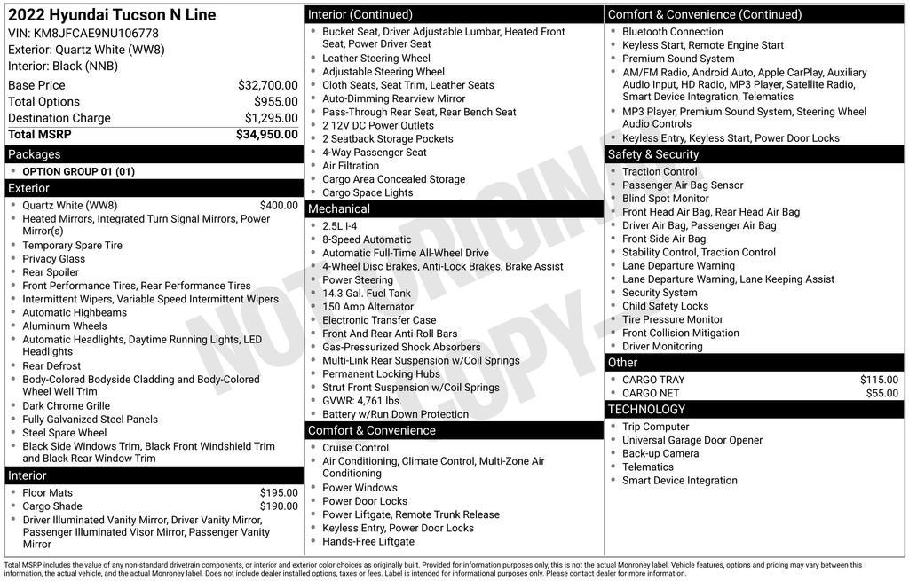Quartz White 2022 Hyundai Tucson N Line 24/29 City/Highway MPGPlease call or e-mail first for the best and quickest information. Visit www.coughlinpataskala.com to see more of this store’s new and used vehicle inventory for sale. Price excludes tax, title, license and document fee. While we make every effort to prevent pricing errors, key stroke and human errors do occur. Please contact dealer for details.