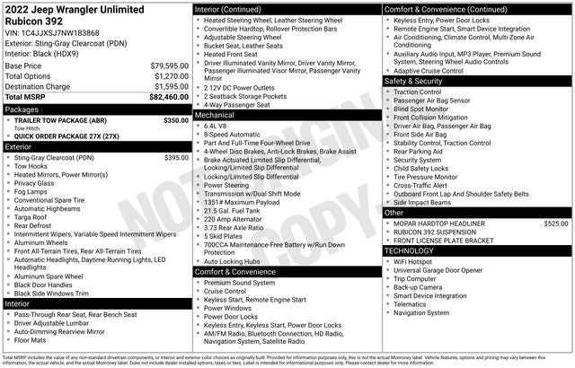 Wrangler Unlimited Rubicon 392, 4D Sport Utility, SRT HEMI 6.4L V8 MDS, 8-Speed Automatic, 4WD, Sting-Gray Clearcoat, Black Leather, 7 & 4 Pin Wiring Harness, Class II Receiver Hitch, Navigation System, Quick Order Package 27X, Trailer Tow Package, 3.73 Rear Axle Ratio, 4-Wheel Disc Brakes, 9 Speakers, ABS brakes, Air Conditioning, Alloy wheels, AM/FM radio: SiriusXM, Apple CarPlay/Android Auto, Auto High-beam Headlights, Auto-dimming Rear-View mirror, Automatic temperature control, Brake assist, Compass, Convertible HardTop, Delay-off headlights, Driver door bin, Driver vanity mirror, Dual front impact airbags, Dual front side impact airbags, Electronic Stability Control, Emergency communication system: SiriusXM Guardian, Freedom Panel Storage Bag, Front anti-roll bar, Front Bucket Seats, Front Center Armrest w/Storage, Front dual zone A/C, Front fog lights, Front License Plate Bracket, Front reading lights, Fully automatic headlights, Garage door transmitter, Glass rear window, Heated door mirrors, Heated front seats, Heated steering wheel, Illuminated entry, Integrated roll-over protection, Leather Shift Knob, Leather steering wheel, Leather Trimmed Bucket Seats, Low tire pressure warning, MOPAR Hardtop Headliner, Occupant sensing airbag, Outside temperature display, Panic alarm, ParkView Rear Back-Up Camera, Passenger door bin, Passenger vanity mirror, Power door mirrors, Power steering, Power windows, Radio data system, Radio: Uconnect 4C Nav w/8.4 Display, Rear anti-roll bar, Rear reading lights, Rear seat center armrest, Rear Window Defroster, Rear window defroster, Rear window wiper, Rear Window Wiper/Washer, Remote keyless entry, Rubicon 392 Suspension, Security system, Speed control, Split folding rear seat, Steering wheel mounted audio controls, Tachometer, Telescoping steering wheel, Tilt steering wheel, Traction control, Trip computer, Variably intermittent wipers, Voltmeter, Wheels: 17 x 7.5 Beadlock Capable, Wrangler Unlimited Rubicon 392, 4D Sport Utility, SRT HEMI 6.4L V8 MDS, 8-Speed Automatic, 4WD, Sting-Gray Clearcoat, Black Leather, 7 & 4 Pin Wiring Harness, Class II Receiver Hitch, Navigation System, Quick Order Package 27X, Trailer Tow Package.