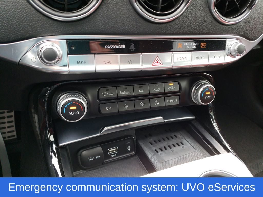 Ceramic Silver 2022 Kia Stinger GT1 AWD 8-Speed Automatic 3.3L V6 DGI Stinger GT1, 4D Sedan, 3.3L V6 DGI, 8-Speed Automatic, AWD, Ceramic Silver, Black Leather, 4-Wheel Disc Brakes, 9 Speakers, ABS brakes, Air Conditioning, Alloy wheels, AM/FM radio: SiriusXM, Anti-whiplash front head restraints, Apple CarPlay & Android Auto, Auto High-beam Headlights, Auto-dimming Rear-View mirror, Automatic temperature control, Brake assist, Bumpers: body-color, Delay-off headlights, Driver door bin, Driver vanity mirror, Dual front impact airbags, Dual front side impact airbags, Electronic Stability Control, Emergency communication system: UVO eServices, Exterior Parking Camera Rear, Four wheel independent suspension, Front anti-roll bar, Front Bucket Seats, Front Center Armrest, Front dual zone A/C, Front reading lights, Fully automatic headlights, harman/kardon® Speakers, Heated door mirrors, Heated Front Bucket Seats, Heated front seats, Heated steering wheel, Illuminated entry, Knee airbag, Leather Seat Trim, Low tire pressure warning, Navigation System, Occupant sensing airbag, Outside temperature display, Overhead airbag, Overhead console, Panic alarm, Passenger door bin, Passenger vanity mirror, Power door mirrors, Power driver seat, Power moonroof, Power passenger seat, Power steering, Power windows, Radio: AM/FM/HD Audio System, Rain sensing wipers, Rear air conditioning, Rear anti-roll bar, Rear reading lights, Rear seat center armrest, Rear window defroster, Red Interior Color Package, Red Leather Seat Trim, Remote keyless entry, Security system, Smart Key w/ Push Button and Remote Start, Speed control, Speed-sensing steering, Speed-Sensitive Wipers, Split folding rear seat, Sport steering wheel, Steering wheel mounted audio controls, Tachometer, Telescoping steering wheel, Tilt steering wheel, Traction control, Trip computer, Turn signal indicator mirrors, Variably intermittent wipers, Wheels: 8.0J x 19 Front/8.5J x 19 Rear Alloy.