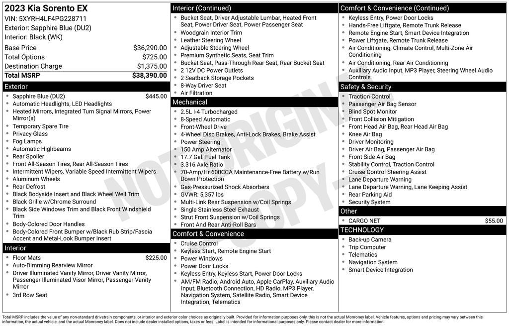 Equipped with 3.316 Axle Ratio, 3rd row seats: split-bench, 4-Wheel Disc Brakes, 6 Speakers, ABS brakes, Air Conditioning, Alloy wheels, AM/FM radio: SiriusXM, Apple CarPlay & Android Auto, Auto High-beam Headlights, Auto-dimming Rear-View mirror, Automatic temperature control, Brake assist, Bumpers: body-color, Cargo Net, Carpet Floor Mats, Delay-off headlights, Driver door bin, Driver vanity mirror, Dual front impact airbags, Dual front side impact airbags, Electronic Stability Control, Emergency communication system, Exterior Parking Camera Rear, Four wheel independent suspension, Front anti-roll bar, Front Bucket Seats, Front Center Armrest, Front dual zone A/C, Front fog lights, Front reading lights, Fully automatic headlights, Heated door mirrors, Heated Front Bucket Seats, Heated front seats, Illuminated entry, Knee airbag, Leather Shift Knob, Leather steering wheel, Low tire pressure warning, Navigation System, Occupant sensing airbag, Outside temperature display, Overhead airbag, Overhead console, Panic alarm, Passenger door bin, Passenger vanity mirror, Power door mirrors, Power driver seat, Power Liftgate, Power passenger seat, Power steering, Power windows, Radio data system, Radio: AM/FM Audio System, Rear air conditioning, Rear anti-roll bar, Rear reading lights, Rear window defroster, Rear window wiper, Remote keyless entry, Roof rack: rails only, Security system, Smart Key w/ Push Button and Remote Start, Speed control, Speed-sensing steering, Split folding rear seat, Spoiler, Steering wheel mounted audio controls, SynTex Artificial Leather Seat Trim, Tachometer, Telescoping steering wheel, Tilt steering wheel, Traction control, Trip computer, Turn signal indicator mirrors, Variably intermittent wipers, and Wheels: 7.5J x 18 Machine-Finished Alloy.