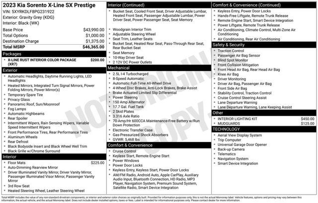 12 Speakers, 3.316 Axle Ratio, 3rd row seats: split-bench, 4-Wheel Disc Brakes, ABS brakes, Air Conditioning, Alloy wheels, AM/FM radio: SiriusXM, Apple CarPlay & Android Auto, Auto High-beam Headlights, Auto-dimming Rear-View mirror, Automatic temperature control, Brake assist, Bumpers: body-color, Carpet Floor Mats, Delay-off headlights, Driver door bin, Driver vanity mirror, Dual front impact airbags, Dual front side impact airbags, Electronic Stability Control, Emergency communication system, Four wheel independent suspension, Front anti-roll bar, Front Bucket Seats, Front Center Armrest, Front dual zone A/C, Front fog lights, Front reading lights, Fully automatic headlights, Garage door transmitter: HomeLink, Heated & Ventilated Front Bucket Seats, Heated door mirrors, Heated front seats, Heated rear seats, Heated steering wheel, Illuminated entry, Interior Lighting Kit, Knee airbag, Leather steering wheel, Low tire pressure warning, Memory seat, Mudguards, Navigation System, Occupant sensing airbag, Outside temperature display, Overhead airbag, Overhead console, Panic alarm, Passenger door bin, Passenger vanity mirror, Perforated Genuine Leather Seat Trim, Power door mirrors, Power driver seat, Power Liftgate, Power moonroof, Power passenger seat, Power steering, Power windows, Radio data system, Radio: AM/FM Bose Premium Audio System, Rain sensing wipers, Rear air conditioning, Rear anti-roll bar, Rear reading lights, Rear window defroster, Rear window wiper, Remote keyless entry, Roof rack: rails only, Security system, Smart Key w/ Push Button and Remote Start, Speed control, Speed-sensing steering, Split folding rear seat, Spoiler, Steering wheel mounted audio controls, Tachometer, Telescoping steering wheel, Tilt steering wheel, Traction control, Trip computer, Turn signal indicator mirrors, Variably intermittent wipers, Ventilated front seats, Wheels: 8.5J x 20 Matte Gray Alloy, X-Line Rust Interior Color Package. 2023 Kia Sorento CARFAX One-Owner. Clean CARFAX.