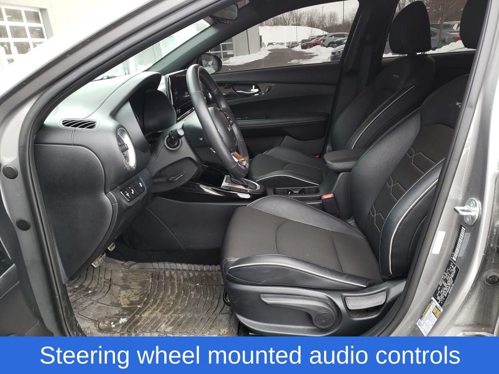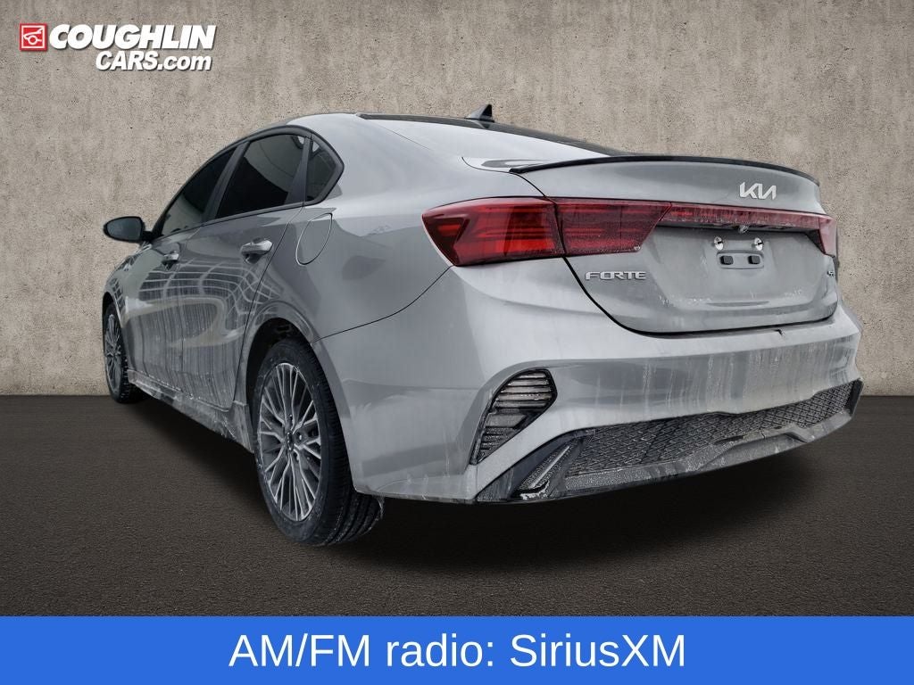 Steel Gray 2024 Kia Forte GT-Line FWD CVT 2.0L I4 MPI Forte GT-Line, 4D Sedan, 2.0L I4 MPI, CVT, FWD, Steel Gray, Black w/Cloth Seat Trim, 4-Wheel Disc Brakes, 6 Speakers, ABS brakes, Air Conditioning, Alloy wheels, AM/FM radio: SiriusXM, Apple CarPlay & Android Auto, Auto High-beam Headlights, Automatic temperature control, Brake assist, Bumpers: body-color, Cloth & SynTex Seat Trim, Delay-off headlights, Driver door bin, Driver vanity mirror, Dual front impact airbags, Dual front side impact airbags, Electronic Stability Control, Emergency communication system, Exterior Parking Camera Rear, Front anti-roll bar, Front Bucket Seats, Front Center Armrest, Front dual zone A/C, Front fog lights, Front reading lights, Front wheel independent suspension, Fully automatic headlights, Heated door mirrors, Illuminated entry, Leather Shift Knob, Leather steering wheel, Low tire pressure warning, Navigation System, Occupant sensing airbag, Outside temperature display, Overhead airbag, Overhead console, Panic alarm, Passenger door bin, Passenger vanity mirror, Power door mirrors, Power steering, Power windows, Radio data system, Radio: 10.25 Display Audio, Rear seat center armrest, Rear window defroster, Remote keyless entry, Security system, Speed control, Split folding rear seat, Spoiler, Sport steering wheel, Steering wheel mounted audio controls, Tachometer, Telescoping steering wheel, Tilt steering wheel, Traction control, Trip computer, Turn signal indicator mirrors, Variably intermittent wipers, Wheels: 17 x 7.0 Alloy.