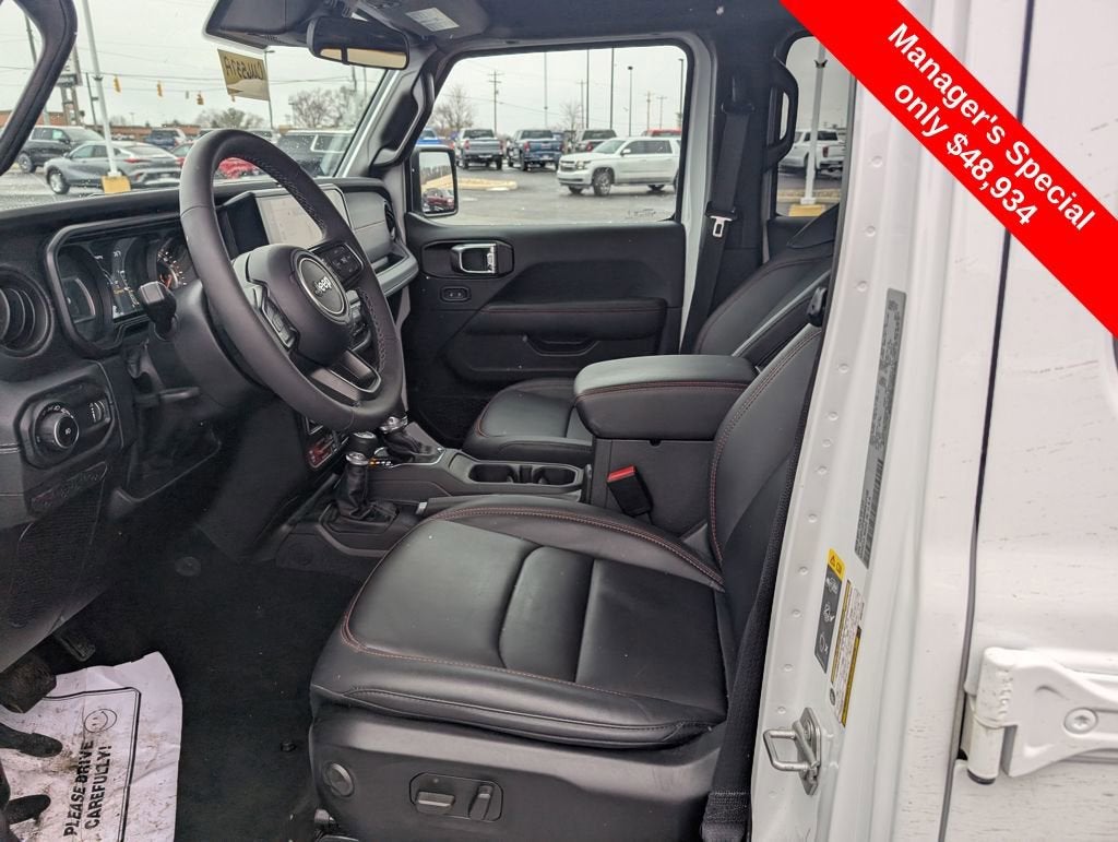 4-Wheel Disc Brakes, 4.10 Rear Axle Ratio, 4G LTE Wi-Fi Hot Spot, 8 Speakers, 97 MPH Vehicle Max Speed Calibration, ABS brakes, Air Conditioning, Alloy wheels, AM/FM radio: SiriusXM, Apple CarPlay, Apple CarPlay/Android Auto, Automatic temperature control, Aux Battery, Auxiliary Switches, Brake assist, Class II Receiver Hitch, Cloth Low-Back Bucket Seats, Compass, Connectivity - US/Canada, Convenience Group, Delay-off headlights, Driver door bin, Driver vanity mirror, Dual front impact airbags, Dual front side impact airbags, Electronic Stability Control, Emergency communication system: Jeep Connect, Front anti-roll bar, Front Bucket Seats, Front Center Armrest w/Storage, Front dual zone A/C, Front fog lights, Front License Plate Bracket (DISC), Front reading lights, Fully automatic headlights, Google Android Auto, Heated door mirrors, Heated Front Seats, Heated Steering Wheel, Illuminated entry, Integrated roll-over protection, Low tire pressure warning, Non-Lock Fuel Cap w/o Discriminator, Occupant sensing airbag, Outside temperature display, Overhead airbag, Panic alarm, ParkView Rear Back-Up Camera, Passenger door bin, Passenger vanity mirror, Performance Suspension, Power door mirrors, Power steering, Power windows, Quick Order Package 24R Rubicon, Radio data system, Radio: Uconnect 5 w/12.3 Display, Rear anti-roll bar, Rear reading lights, Remote keyless entry, Security system, Speed control, Split folding rear seat, Steering wheel mounted audio controls, Stop-Start Dual Battery System, Tachometer, Telescoping steering wheel, Tilt steering wheel, Traction control, Trip computer, Universal Garage Door Opener, Variably intermittent wipers, Voltmeter, Wheels: 17 x 7.5 Machined/Painted Black. 2025 Jeep Wrangler CARFAX One-Owner. Clean CARFAX.